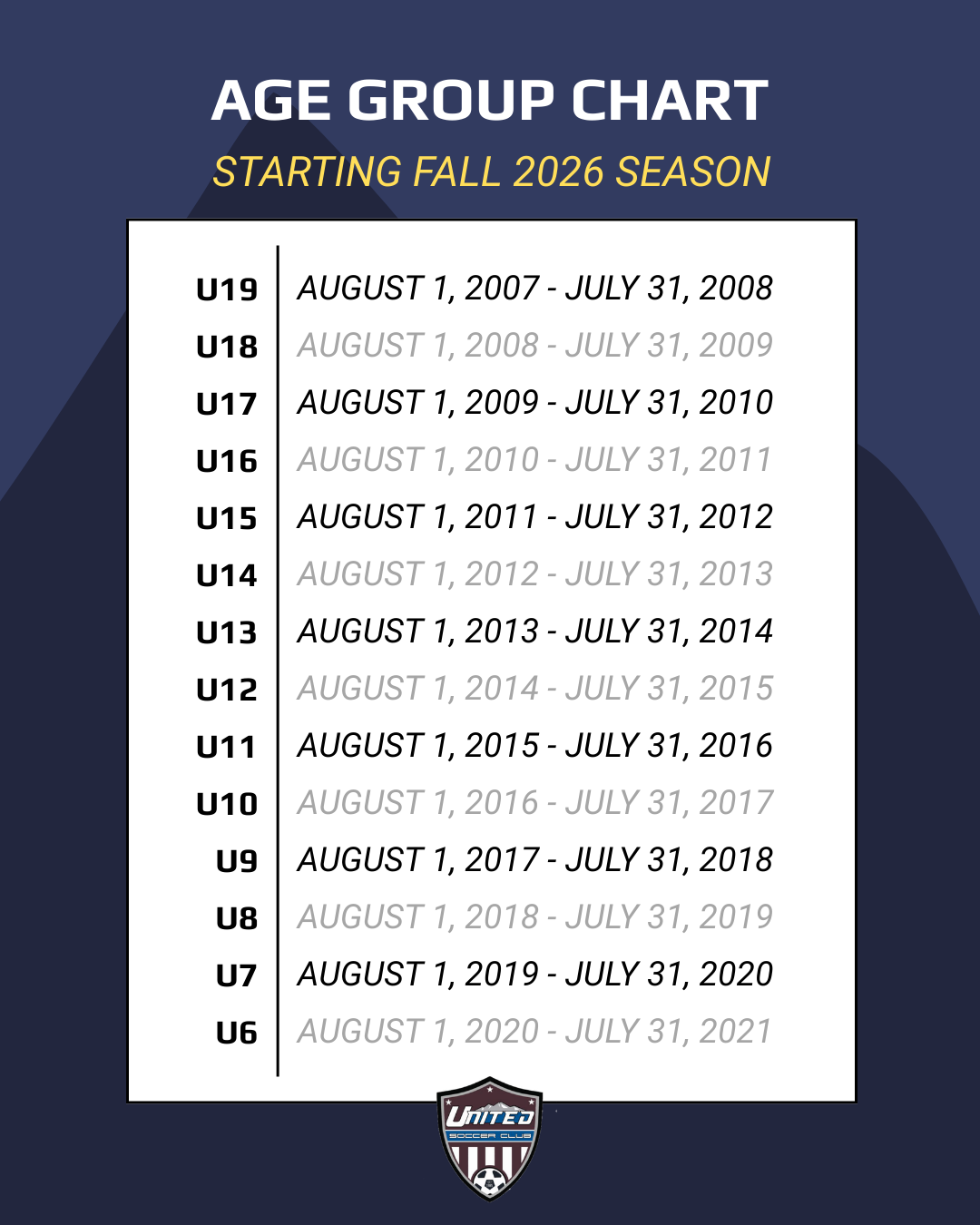 Beginning with the 2026–2027 season, age group cut-offs will shift to August 1 – July 31. This is a change from the previous cut-off of January 1 – December 31.